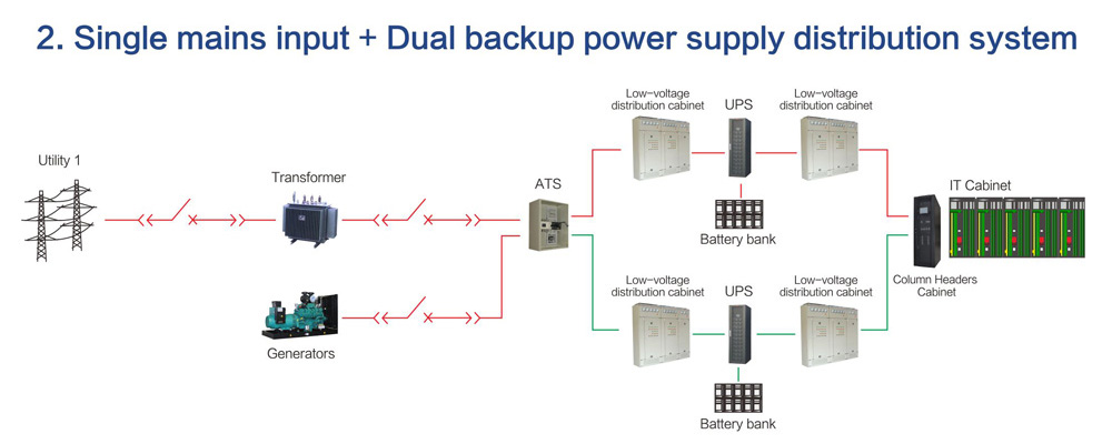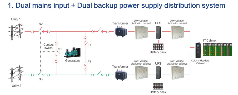 The power supply and distribution system is one of the most important subsystems of the data center. The pre-planning should consider security reliability, system upgrade and capacity expansion, program type, availability, economy and so on. Data center power supply and distribution system consists of high-voltage power supply system and low-voltage distribution system, composed of different power supply and distribution programs to form a complete power supply system. According to the actual situation of different projects, our engineer will offer the best power supply and distribution solution for your datacenter.