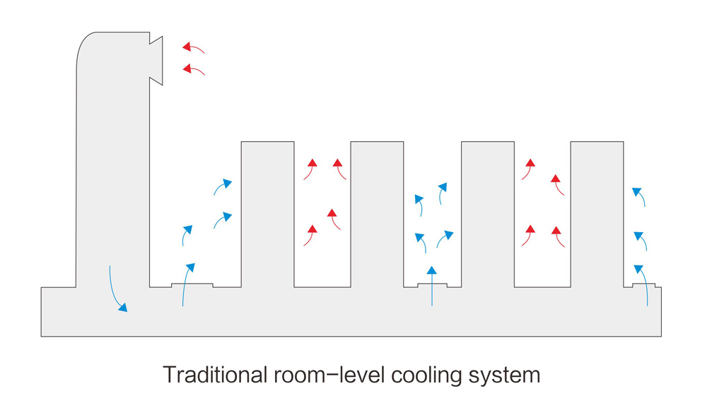 The traditional cooling system can’t make full use of the cooling capacity.When the air conditioning unit is blowing, a large part of the cold air bypasses the IT load and returns directly to the air conditioner. Reducing the total cooling capacity, air conditioning utilization and cooling efficiency is relatively low.