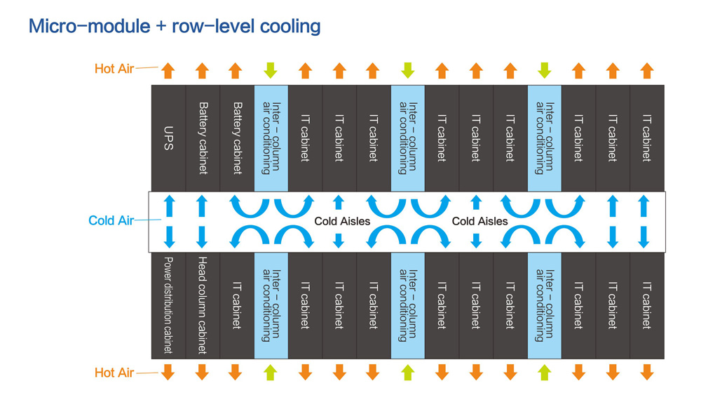 When using row-level cooling configuration, the air conditioning units are associated with a IT cabinet, compared with traditional room-level cooling, the air flow is short and the predictability of the airflow is high, the cooling capacity of the air conditioner can be fully utilized.