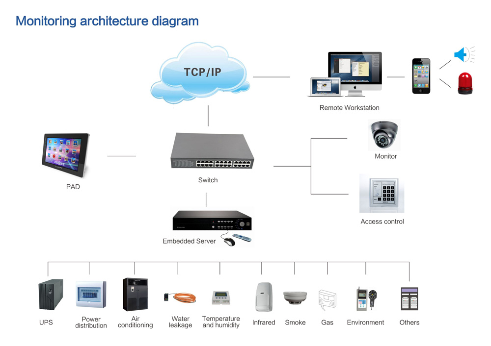For single module data center, the monitoring and management system integrates power monitoring, environmental monitoring, security monitoring, energy management, asset management, operation management and maintenance to ensure a high energy efficient, energy-saving, safe and reliable data center.