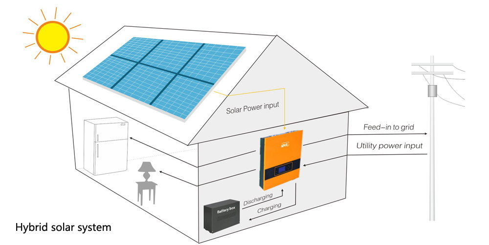 Solar inverter hybrid(dua arah) adalah PV energy dipadukan dengan sistem penyimpanan energy. Memanfaatkan tenaga matahari, listrik AC dan tenaga baterai untuk memastikan pasokan daya yang terus menerus, pengguna dapat menyimpan daya yang tidak terpakai di siang dengan PV system ke dalam baterai dan menggunakannya saat dibutuhkan bahkan pada saat malam hari, ini dapat meningkatkan pemenuhan daya listrik sendiri.