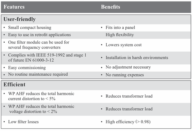 Wise Power Active Harmonic Filter adalah harmonic filters tingkat lanjut, tidak dapat dibandingkan dengan harmonic trap filters tradisional. Harmonic filters WP telah dirancang khusus sesuai untuk semua jenis beban linier atau non-linier di bangunan komersial & industri modern. Peralatan menghitung arus distorsi harmonik dari beban dan menyuntikkan jumlah arus reaktif yang sama dengan pergeseran fasa berlawanan 180 derajat dan membatalkan distorsi yang dihasilkan oleh peralatan.
