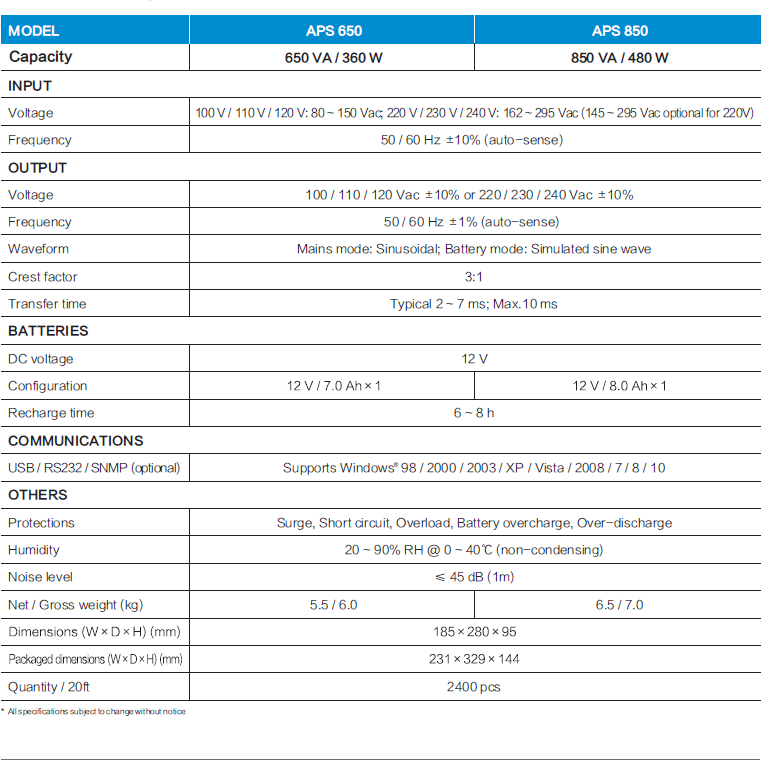 Highlights Compact and ergonomic design 3 sockets protected against black-outs 3 sockets protected against overvoltage Auto restart Cold-start capability Effective protection Battery hot swappable | Applications SOHO, PC, TV, ATM Commercial POS machine Small communication switch Routers, SOHO Network equipment Workstations and peripheral equipment |