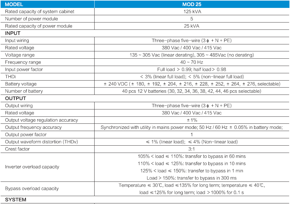 UPS modular 25 series adalah UPS modular kelas atas dengan teknologi kontrol DSP terbaru dan komponen merek terkenal yang paling dapat diandalkan. Ini mengadopsi desain modular yang sangat cerdas, yang utamanya terdiri atas modul daya, modul bypass dan modul kontrol, semua modul mendukung “plug & play” untuk memudahkan perbaikan dan pemeliharaan UPS. Daya dan tingkat redundansi UPS yang tersedia dapat dikembangkan secara vertikal mulai dari 25 kVA / 25 kW sampai dengan 125 kVA / 125 KW dalam satu single power cabinet dengan konfigurasi fleksibel untuk memenuhi berbagai kebutuhan. Berdasarkan kinerja listrik yang unggul, fungsi perlindungan perangkat keras dan perangkat lunak yang sempurna, UPS modular 25 series dapat beradaptasi dengan lingkungan jaringan yang berbeda dan memberikan perlindungan maksimum dan daya berkualitas tinggi untuk beban penting di data center atau aplikasi penting lainnya.