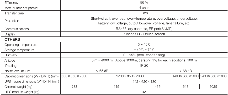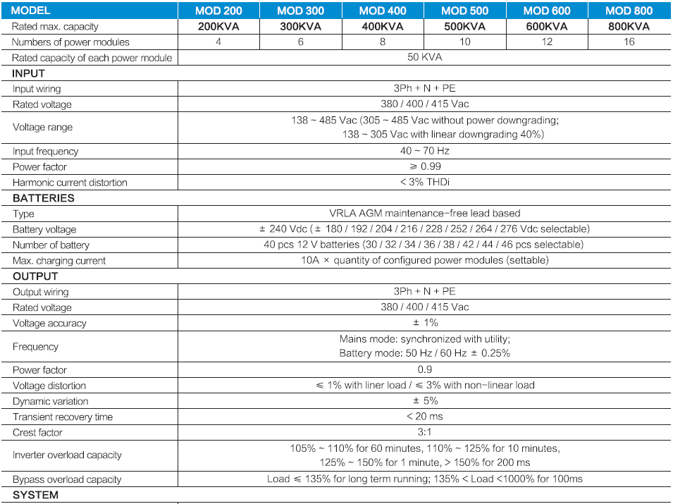 UPS modular 50 series adalah sistem proteksi daya UPS 3-fase yang redundan, fleksibel, dengan on-line double-conversion dan teknologi full control DSP. Konfigurasi modul daya yang hot-swappable dan fleksibel membuat kapasitas tersedia mulai dari 50 KVA hingga 800 KVA, dan kapasitas sistem dapat ditingkatkan menjadi 2400 KVA dengan teknologi paralel nirkabel "N+X" dan redundansi yang canggih. Semua modul internal (modul kontrol, modul daya, dan modul bypass) dirancang secara modular dan hot-swappable, memastikan kekompakan sistem, keandalan, dan perawatan yang mudah.